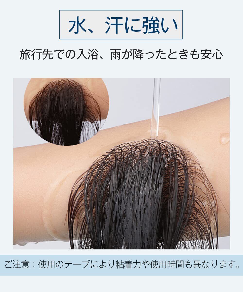 水、汗に強く:雨も汗にも安心です。接着力が落ちてきたときは、新しい専用のウィッグテープを使ってください。もともとの接着力が復活します。
