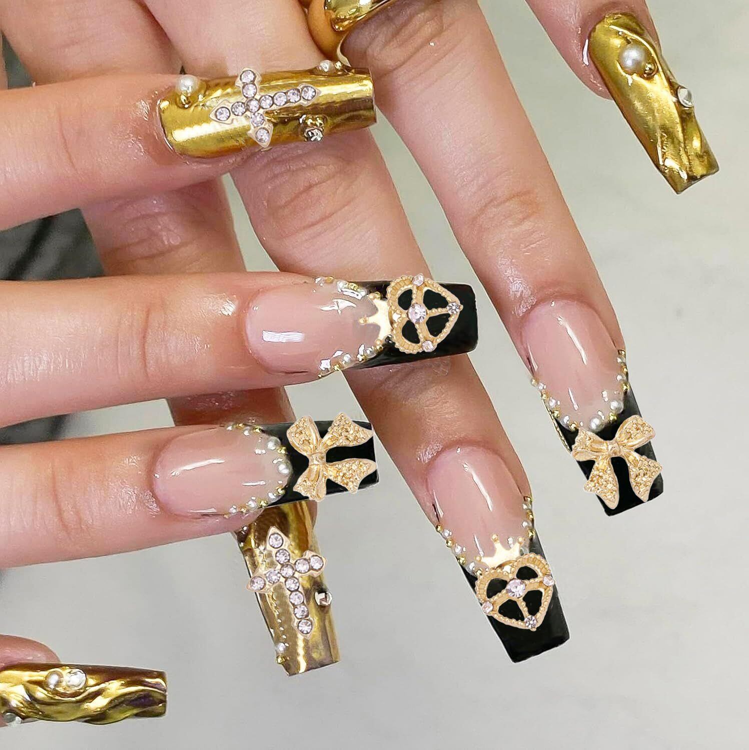 【素材】ネイルパーツは高品質の合金とラインストーンで作られており、質感と光沢に優れ、丈夫で耐久性があり、色あせや錆びにくいです。快適で滑らかな手触りで肌にやさしいです