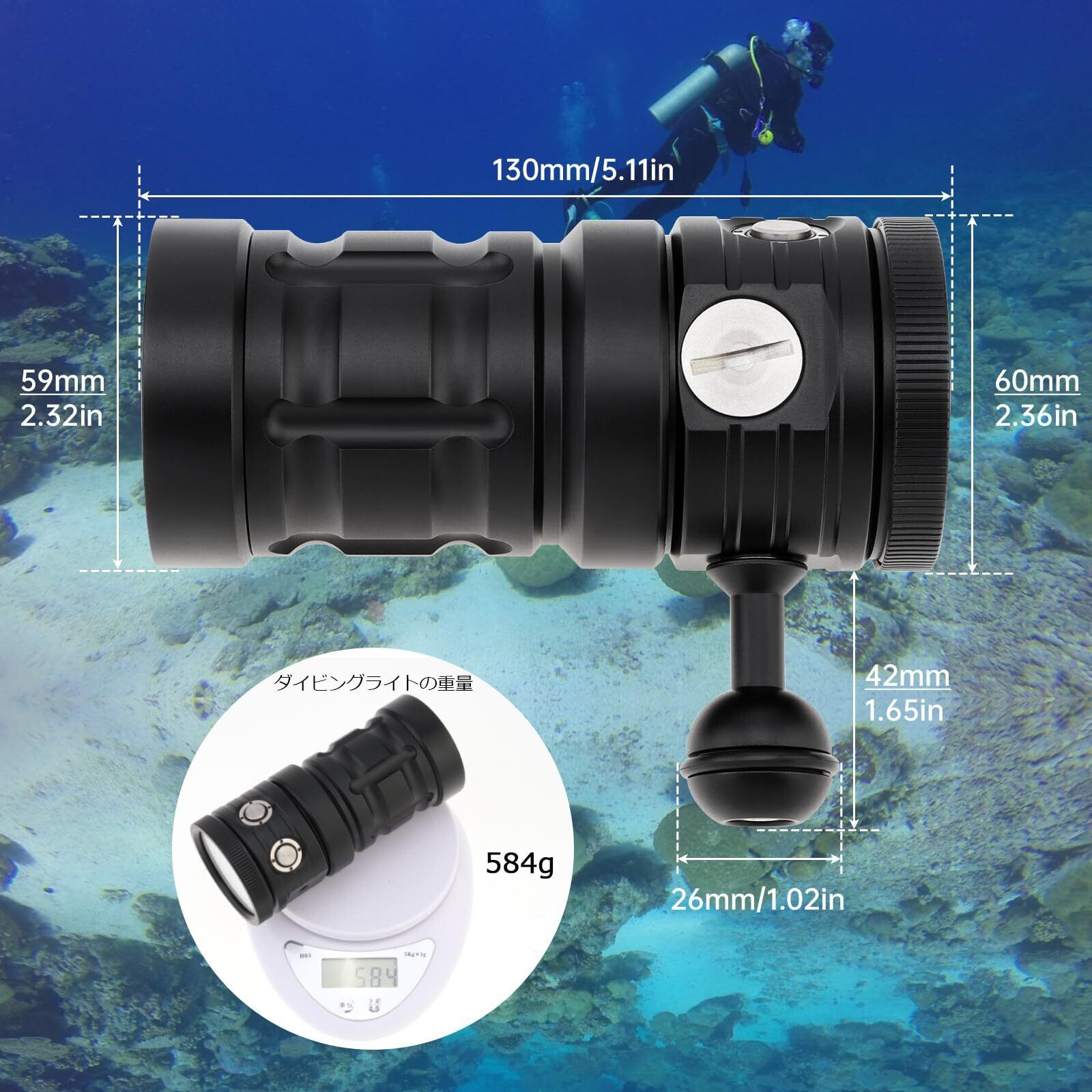 【多彩な光源&水中撮影に最適】DF14 ダイビングライトは、高輝度COB LEDを搭載し、最大18000ルーメンの強力な光。120°ワイドビームは、水中150メートルでも鮮明に視認でき。白・青・赤3色切替で、多彩な光源は水中生物の本来の色を鮮明に再現して、水中撮影に最適。