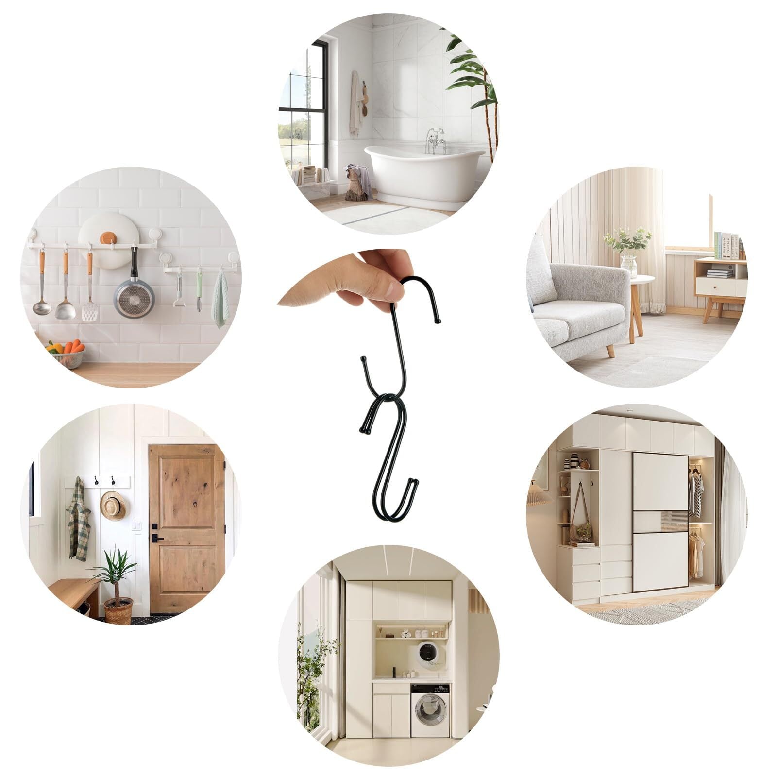 広い用途:汎用フックは室内に限らず室外にも活躍に使用できます。クローゼット、お風呂、収納室、ガレージ、オフィスに配置したり、好みに応じて屋外に植物かごや鈴、提灯などを吊るしたりするのにも適しています。