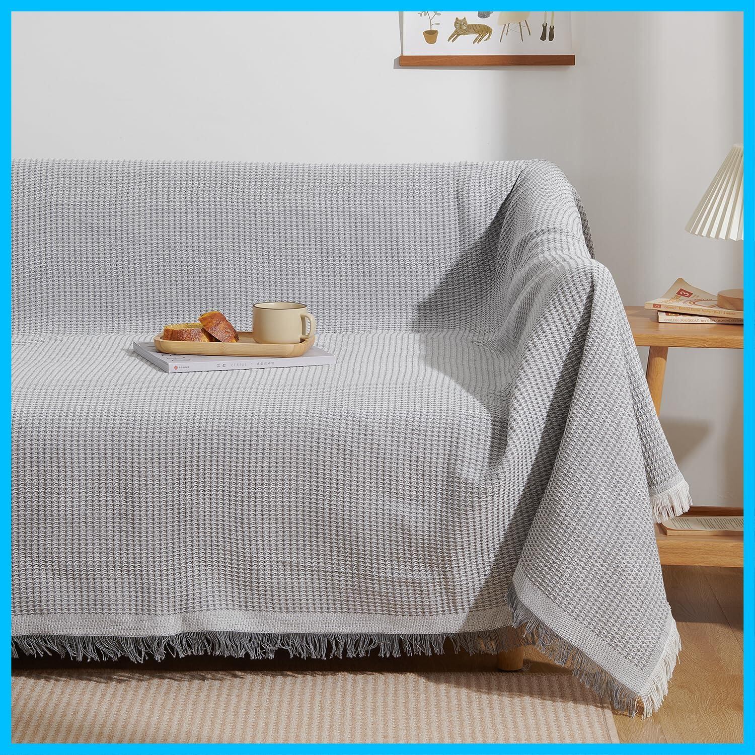 Atokazo ソファーカバー 北欧風 マルチカバー ソファカバー 肘付き 肘なし 多機能 ブランケット 綿 リバーシブル フリンジ付き おしゃれ 保護カバー 防塵 キズ防止 汚れ防止 洗える 四季通用 グレーホワイト・ワッフル柄 90X180cm(1人掛け) | グランメゾンショップ