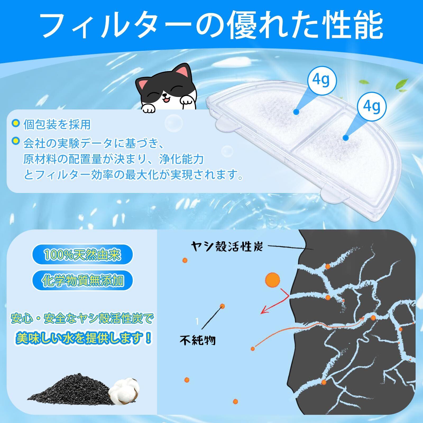 三層構造:給水器交換用活性炭フィルターは、ペットの毛、塩素、重金属など 不純物を効果的にろ過し、硬水軟化、細菌の繫殖を抑えて、ペットの水を清潔で新鮮な状態に保ちます
