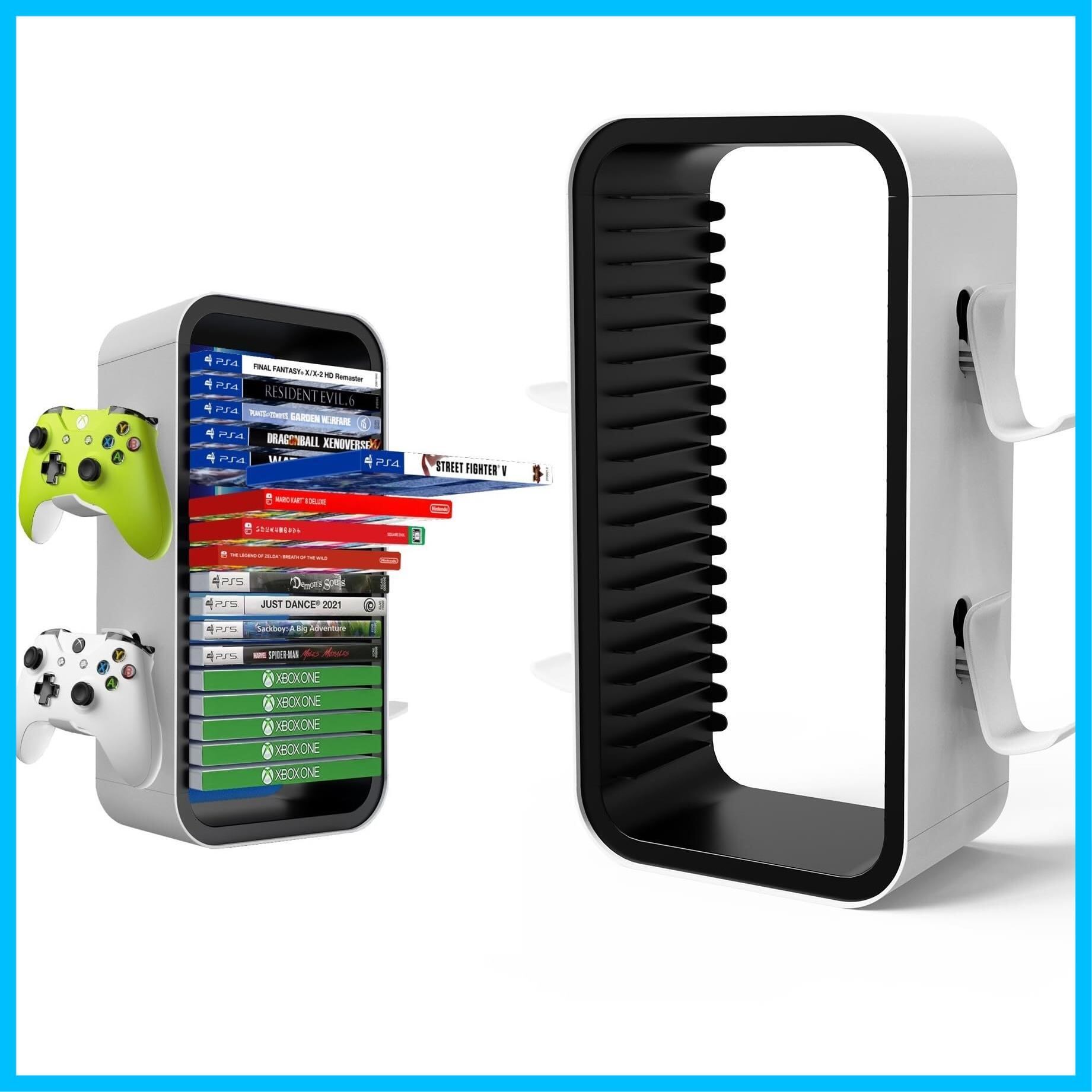 wigmoaゲームソフト 収納タワー ストレージスタンド PS5/PS4/PS3/Xbox Series S & X/Switch ブルーレイ【18枚収納可能+コントローラーホルダー付き】ゲームカセット 便利グッズ 省スペース 縦置きスタンド. OYO-1 (白/黒)