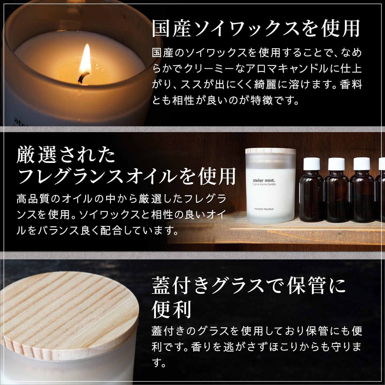 国産のソイワックスを使用することでなめらかでクリーミーなアロマキャンドルに仕上がっています。 国産のソイワックスはススが出にくく綺麗に溶けていくのも特徴です。 香料とも相性が良いのでアロマオイルの香りを邪魔しません。