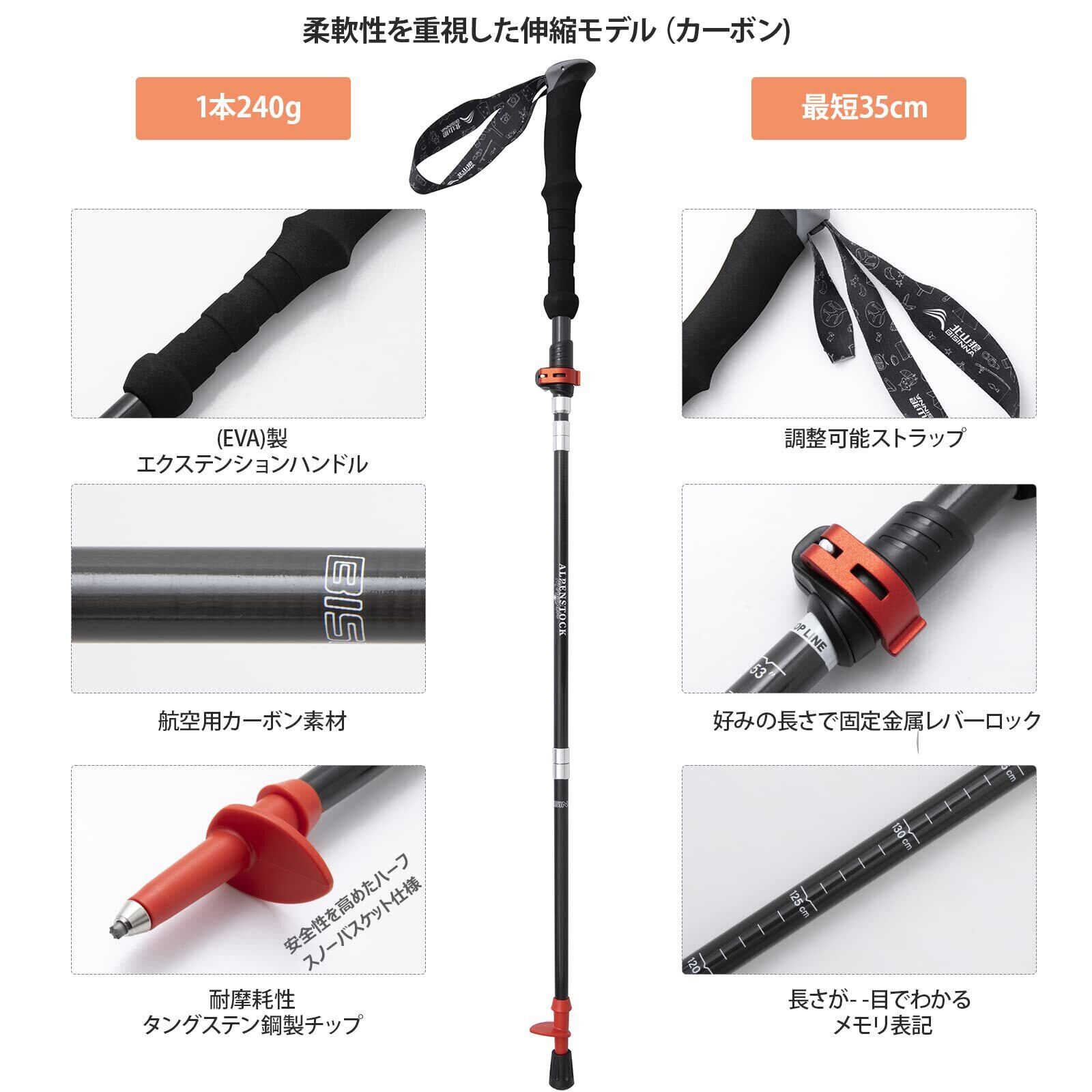 【超軽量材質】超軽量で耐久性があるカーボンファイバー素材を採用していて、重量はわずか240g一本、軽量で折れにくいです、長時間の使用でも負担になりません。ポール先端は上質なタングステン合金を採用しています、摩損にくいで安定性も抜群です。