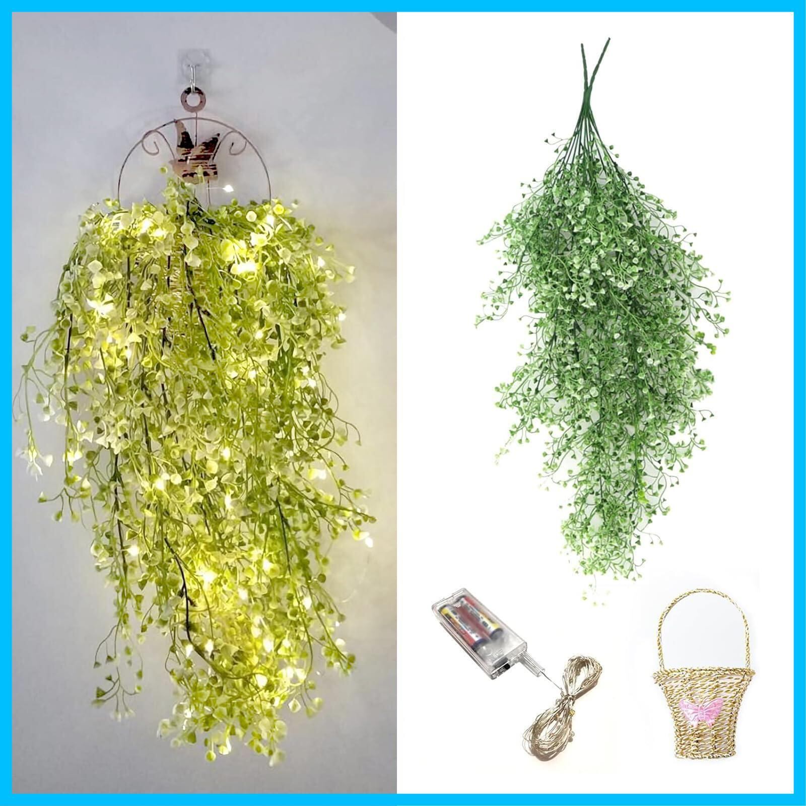 【Charming Club】フェイクグリーン 吊り下げ 人工観葉植物 壁掛け LED アイビー イルミネーションライト付き 枯れない 金梅 85cm おしゃれ 壁の装飾 インテリア 造花 ぶら下げバスケット付き ベランダ デコレーション 引越し祝い 新生活向けプレゼント 紐付き 電池式 (金梅)