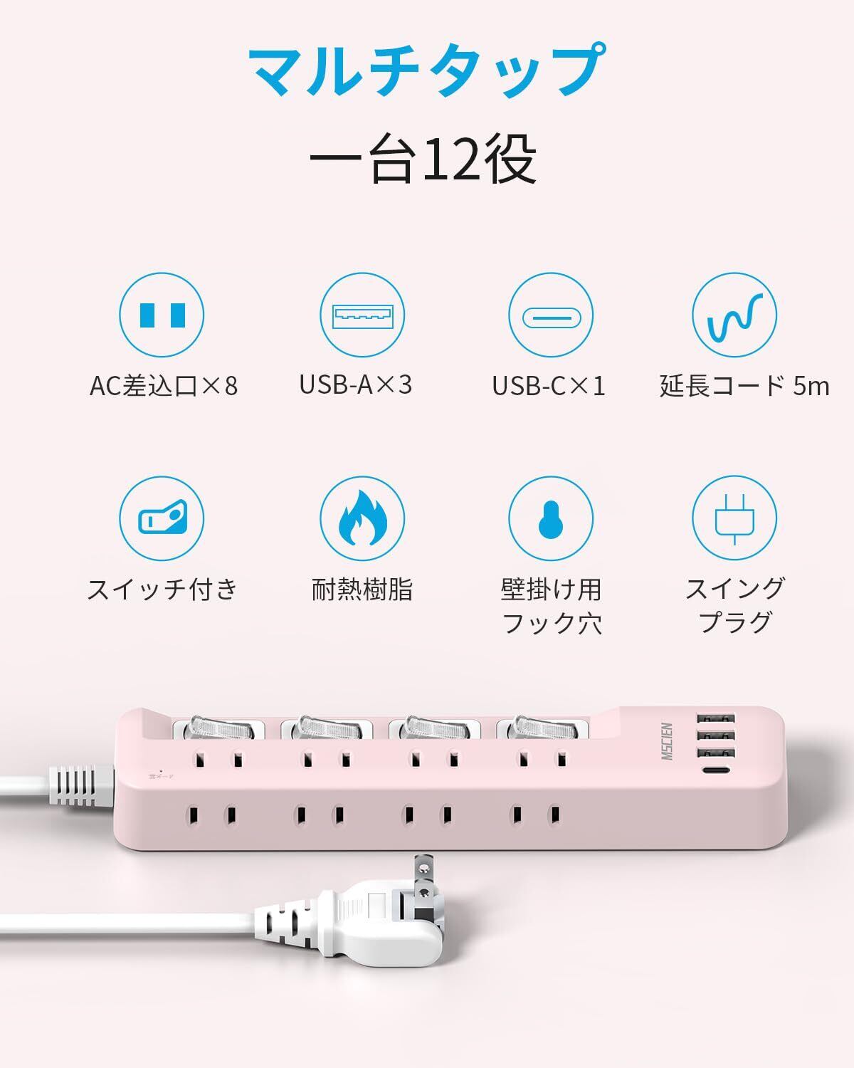 Mscienエムサイン 電源タップ usb付き 8個AC口 1個usbc 3個usba 延長コード 5m 雷ガード usb コンセント oa スイッチ付き 壁掛け たこあしコンセント テーブルタップ マルチタップ スイングプラグ おしゃれ ピンク 可愛い | グランメゾンショップ