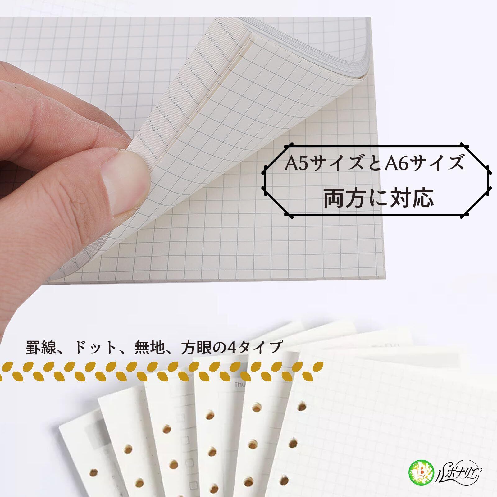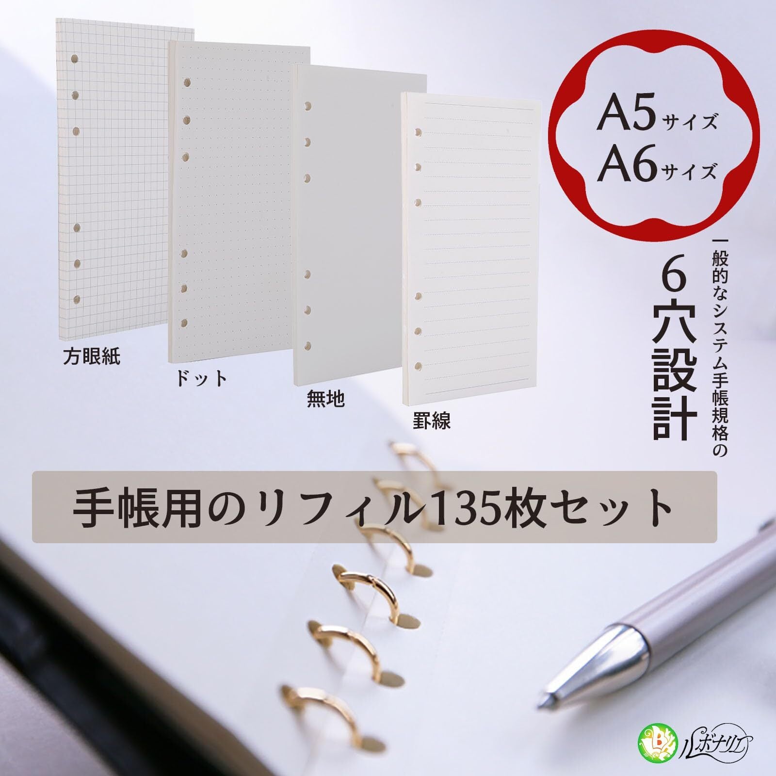 システム手帳やビジネス手帳用のリフィル135枚セットです。A5サイズとA6サイズで罫線、ドット、無地、方眼の4種類の8タイプをご用意しました。ご用途に合わせてお選びください。